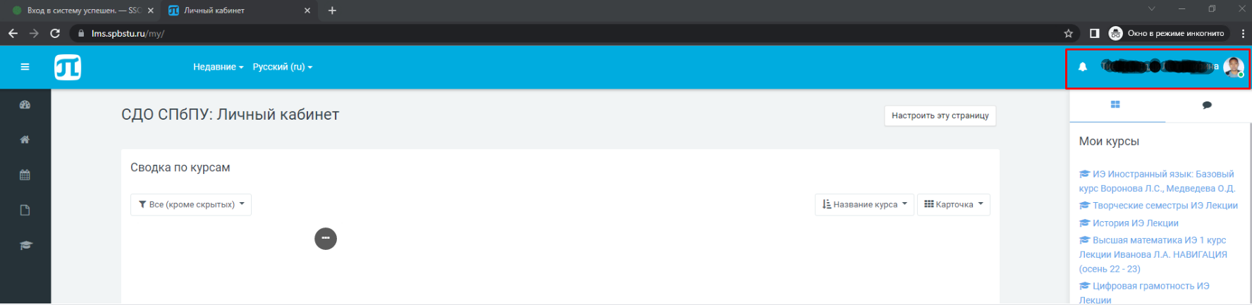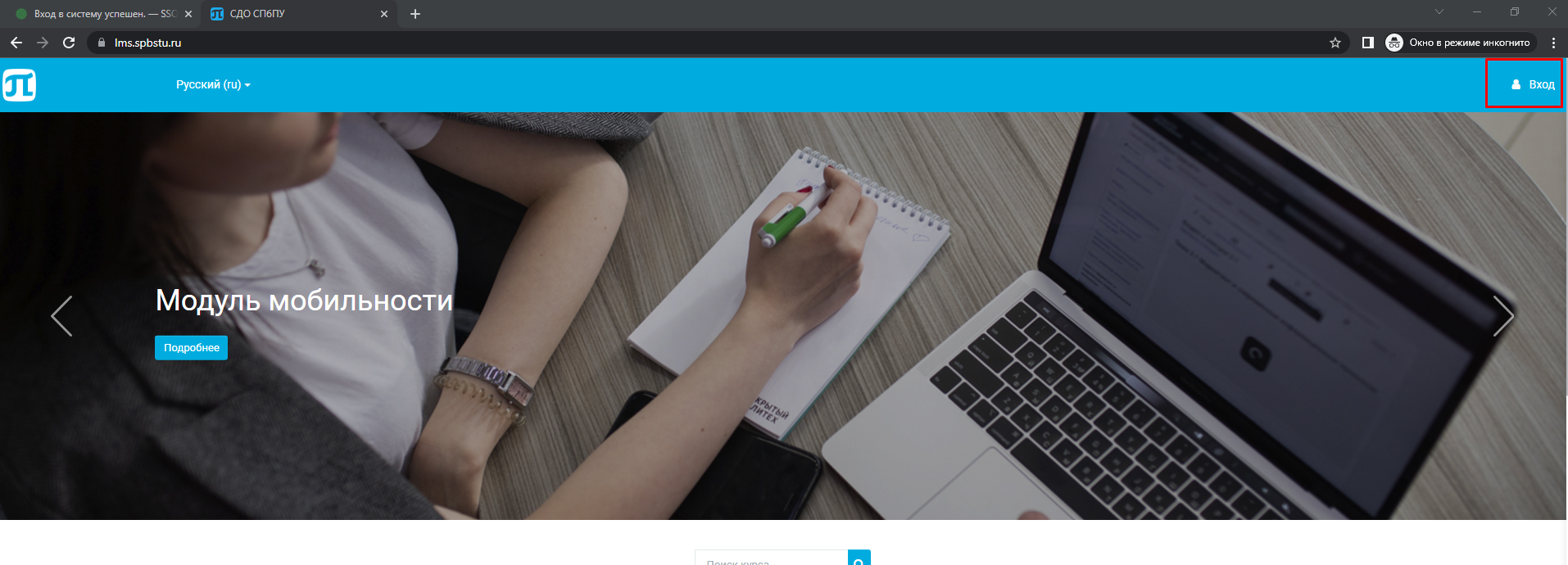 - Открываете рядом новую вкладку в браузере, вводите там адрес: https://lms.spbstu.ru/ и нажимаете на "ВХОД" в правом верхнем углу: