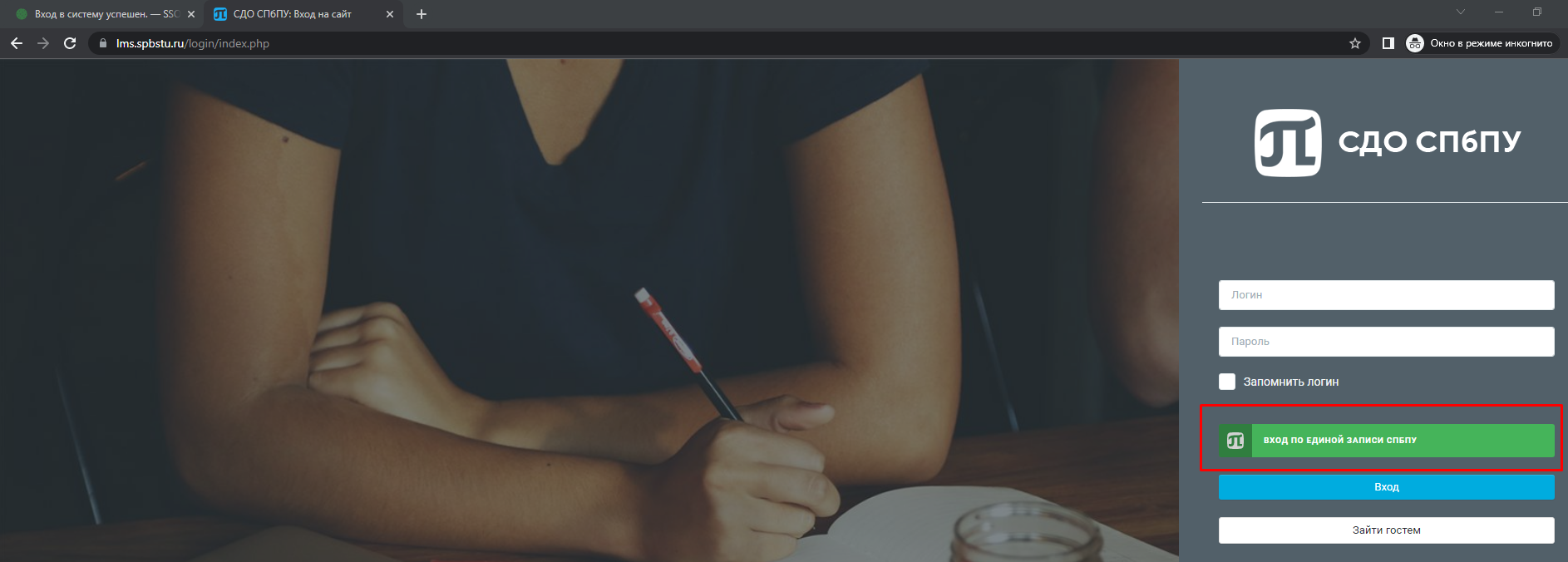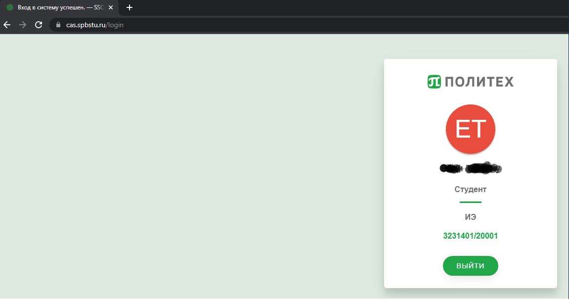 - Нажимаете на большую зеленую кнопку "ВХОД ПО ЕДИНОЙ ЗАПИСИ СПБПУ":